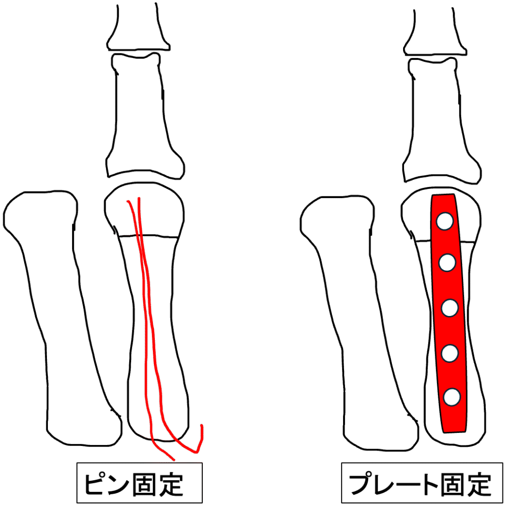 骨の変形が強い場合や、職業的に手を多く使う人では、ピン固定やプレート固定を行うこともあります。よほど、骨折がひどくない限りはピンで固定することが多く、その場合は4〜6週程度で抜釘することが多いです。術後にギプスなどで固定をする場合もありますが、基本的には長くても2週間程度で外れる場合が多いです。
