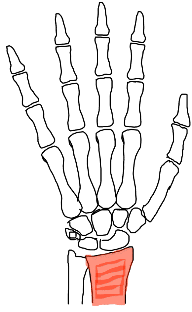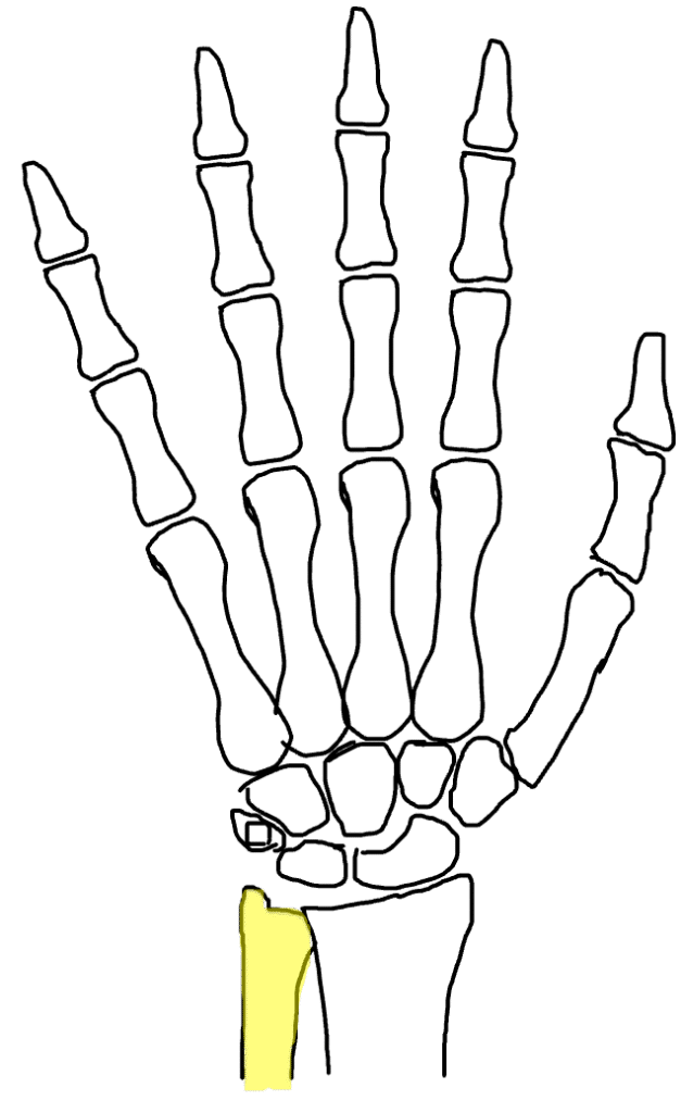 橈骨の端には”茎状突起(けいじょうとっき)”と呼ばれる出っ張りがあります。レントゲンをみる時の重要な指標となります。