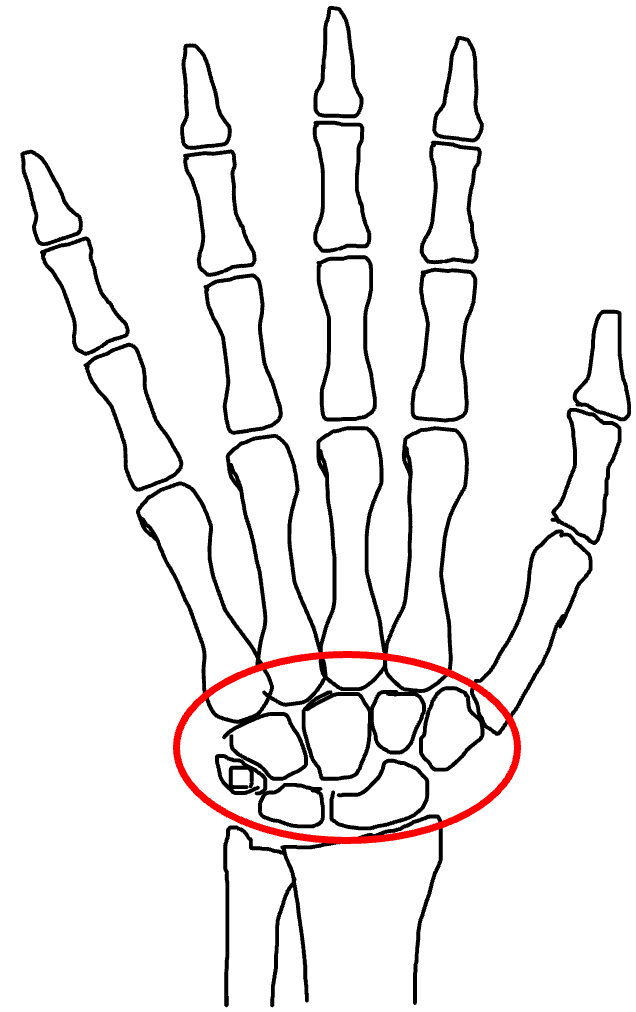 この骨は小さい台形の形のため、小菱形骨です。比較的骨折などはあまり認めない骨です。しかし、第2中手骨や舟状骨、大菱形骨、有頭骨と隣接しており、全体の安定性に関わる重要な”つなぎ役”としての存在です。